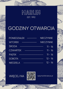 MARLIN to Sieć Sklepów Rybnych & Smażalni Ryb 🔱 Ryby w Krakowie od 1992 ✅ Nasze lokale hybrydowe oferują Państwu ryby pod każdą postacią 🔤 Kupisz w nich ryby smażone 🐟🍟, ryby świeże (morskie oraz słodkowodne), własne przetwory rybne i śledzie premium oraz sushi. W propozycjach nie zabraknie również ryb wędzonych naturalnie, tatarów z łososia, pstrąga i tuńczyka, a także zup rybnych. Sprawdź trasę lub zamów online i przekonaj się sam 📍 Dostawa Ryb na terenie Krakowa 🏠 4 Lokalizacje